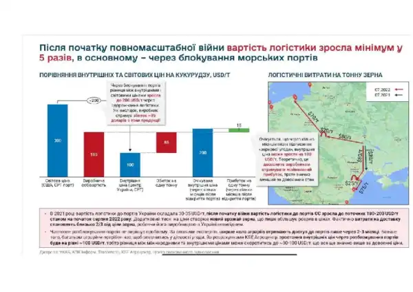 Для більшості компаній, навіть після підписання «зернової» угоди, вартість логістики до порту становить 70–80 дол США/т, порівняно з 20-30 дол США/т до початку повномасштабної війни.