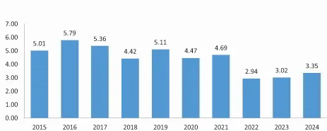 Рис 2. Динаміка сукупного збору ячменю ярого 2015–2024 рр., млн. т