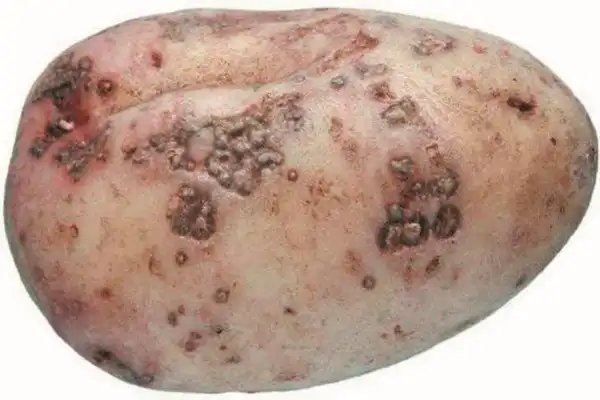 Форма і розмір пустул, а також типи деформації тканин бульб, що прилягають до пустул, залежать від резистентності сорту. Виділяють п’ять варіантів прояву ооспорозу на бульбах: