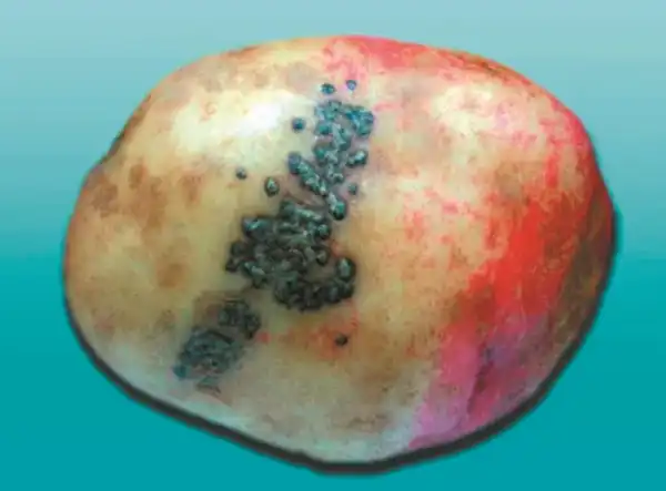 На деяких сортах картоплі хвороба проявляється як чорні плями («чорна шкірка»), які розповсюджуються на вічка. Бруньки у вічках гинуть, і картоплини втрачають здатність до проростання.