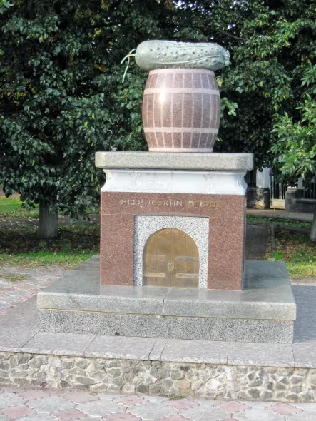 Пам’ятник ніжинському огірку знаходиться у сквері недалеко від будівель Ніжинського консервного заводу (вул. Шевченка, дім 160), який є, власне, основним виробником відомого в Україні та за її кордонами продукту. Автор задуму — місцевий творець Леонід Воробйов