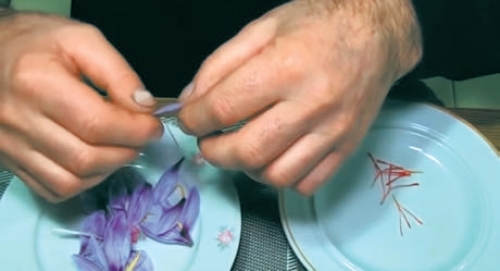 Видалення червоних рилець із квіток крокусу роблять відразу після їхнього збору, що полегшує сам процес та забезпечує отримання якісної сировини. Для відокремлення червоних «ниточок» можна використовувати свої нігті або невеликі інструменти, такі як ножиці чи пінцет. Для виготовлення спеції шафрану використовують лише червоні рильця. Жовті тичинки й фіолетові пелюстки для цього не застосовують! Поки що ми ще не придумали, що з ними робити, тому просто викидаємо їх.