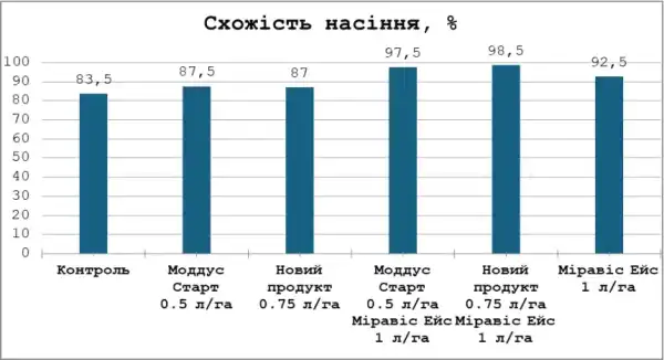 4. Комбіновані схеми — Новий продукт + Міравіс® Ейс та варіант Моддус® Старт + Міравіс® Ейс — продемонстрували показники схожості на рівні 98 %. Такі показники є стандартом для високоякісного посівного матеріалу і прямим наслідком найнижчого рівня ураження фузаріозом (близько 15 %).