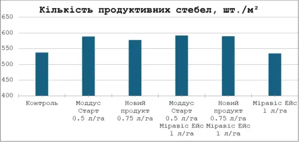 Облік кількості продуктивних стебел проводився у фазу молочно-воскової стиглості. Рис. 1 наочно демонструє, що застосування ретардантів у фазу ВВСН 31 має прямий і виражений позитивний вплив на такий важливий показник структури врожаю, як кількість продуктивних стебел. Контрольний варіант та варіант із застосуванням лише Міравіс® Ейс у фазу цвітіння на момент обліку сформував 538 і 535 шт./м² продуктивних стебел відповідно (однакова статистична група). Варто також відмітити, що кількість стебел на цих варіантах поступово знижувалася, починаючи з фази прапорцевого листа й до середини цвітіння (ВВСН 39–65), і це було пов’язано з реутилізацією та «скиданням» стебел. Водночас усі варіанти, де використовували лише ретарданти або в поєднанні з фунгіцидом, продемонстрували збільшення та збереження продуктивного стеблостою від 8 до 11 %, що надалі мало позитивний вплив на врожайність. Дані досліду однозначно доводять, що для забезпечення оптимізації структури майбутнього врожаю критично важливим є своєчасне застосування регуляторів росту.
