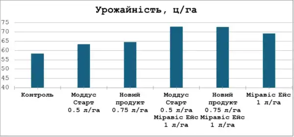 Представлена на рис. 4 інформація свідчить, що найнижчу врожайність було отримано на варіанті Контроль — 58,33 ц/га (зважаючи на вище описану та подану інформацію, цілком очікуваний результат). Варіанти з використанням ретардантів (Моддус® Старт і Новий продукт) продемонстрували збільшення врожайності на 5–6 ц. Застосування лише Міравіс® Ейс дало значно більшу прибавку (+10,83 ц/га).