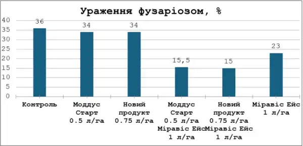 На діаграмі проілюстровано відсоток ураження посівів фузаріозом залежно від застосованої схеми захисту. Аналіз результатів дозволяє зробити такі висновки: варіанти Контроль, Моддус® Старт і Новий продукт без внесення Міравіс® Ейс у фазу цвітіння продемонстрували відсоток ураження фузаріозом на рівні 34–36 %. На варіанті, де було внесено лише фунгіцид Міравіс® Ейс у нормі 1 л/га, вдалося знизити ураження до 23 %. Це підтверджує надзвичайно високу ефективність препарату в боротьбі зі збудником фузаріозу. Проте комбіновані схеми показали найвищий рівень захисту та ефективності, а також найнижчий відсоток ураження було досягнуто у варіантах, де поєднувалися регулятори росту та фунгіцид Міравіс® Ейс: 15,5 % із Моддус® Старті 15 % із Новим продуктом.