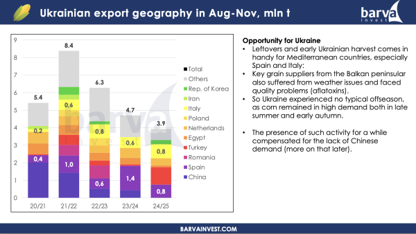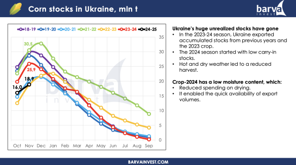 • У сезоні 2023–24 Україна експортувала не лише врожай поточного сезону, а й залишки попереднього сезону (2022–23). Це призвело до мінімальних перехідних запасів у новому сезоні. За станом на листопад, загальний обсяг кукурудзи в Україні, враховуючи зібраний і незібраний урожай, становить близько 19 млн тонн — це найнижчий показник за останні сім років. І це спричинило зростання цін на українську кукурудзу порівняно з конкурентами.
