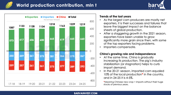 • У сезоні 2024–25 очікується зниження світового виробництва кукурудзи на 10 млн т, переважно через зменшення врожаю у ключових країнах-експортерах. Наприклад, США виробили 385 млн т, що на 5 млн т менше, ніж минулого року, коли було зафіксовано рекорд. У країнах-імпортерах, таких як Китай, виробництво збільшується, а потреба в імпорті зменшується.
